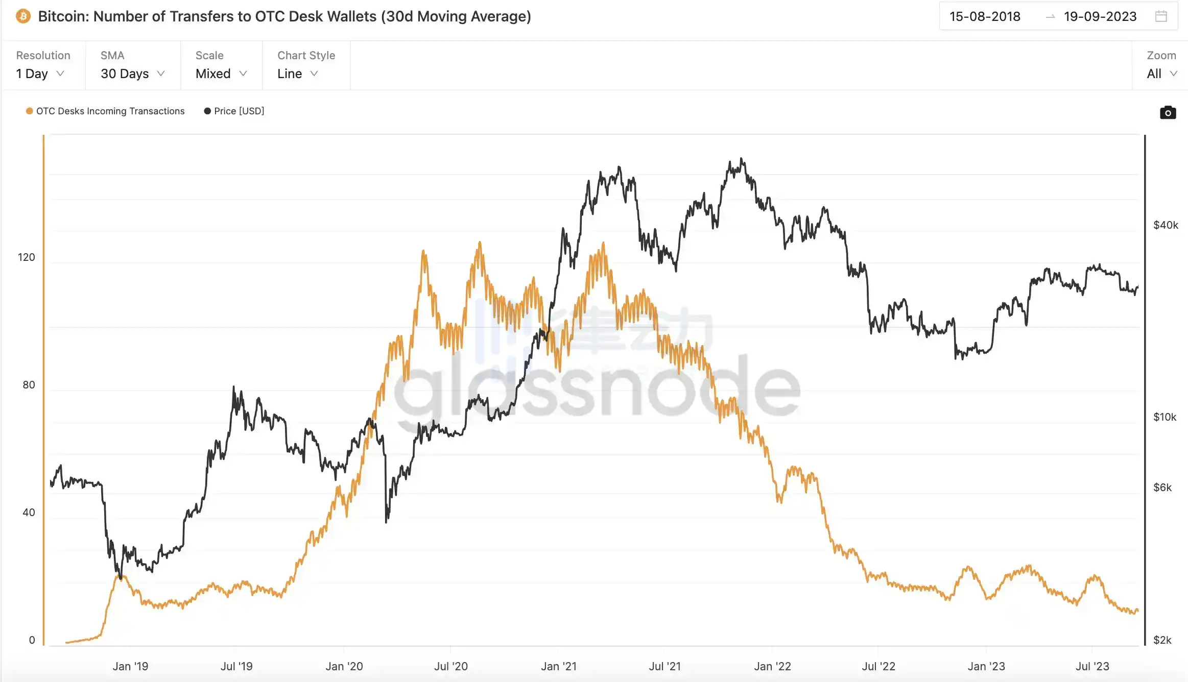 数据:比特币 OTC 交易量已降至历史低位水平,与 2018 年年底相当