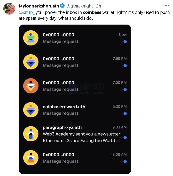 本次事件中,部分用户在社交媒体平台发文质问 XMTP 官方,表示自己每天都在收到垃圾邮件推送。