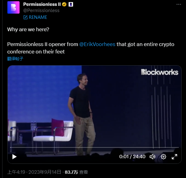 9 月 14 日,在由 Blockwork 和 Bankless 共同主办的全球最大 DeFi 活动 Permissionless II 上,资深行业 OG,ShapeShift 的创始人 Erik Voorhees 奉献了一场精彩至极的演讲。