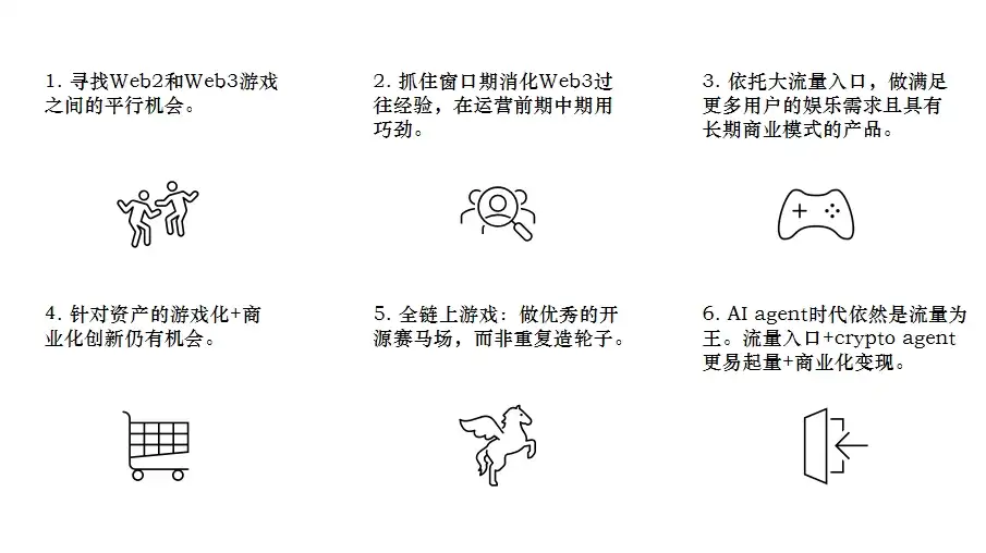 此外,对于那些仍在探索和观望团队而言,首先可以在 web2 获客成本居高不下且商业模式出现瓶颈之际抓住 Web2 和 Web3 之间的平行机会,尤其是以休闲游戏和 AI 带动的大量玩家群体。其次,总结和消化过往成功/热点项目经验,也能学到很多方法论,在运营中用巧劲。第三,可以在大流量入口之上做满足更多用户娱乐需求且具有长期商业模式的产品。第四,基于新的资产形式,资产的游戏化+商业化创新仍有机会。然后,对于全链上游戏,更建议团队做优秀的开源赛马场而不是重复造轮子,或许有机会开启下一波热潮。最后,未来的 Crypto agent(crypto+AI)领域也大概率依旧是流量为王,团队应该坚持流量主导的路径,在不远的将来链上 AI agent 必定倾向于与优质的流量入口合作。