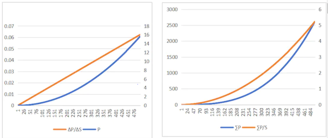 Ponzi 的内核是让早进入者赚钱,如果假想所有用户是一个一个排队进入的话,考虑 S 只能取整数,所以应该使用差分和求和。可以看出,ΔP/ΔS 是线性递增的,这保证了随着 Key 数量的增长,Key 的价格会增长,而且 Key 价格增长的速率也是递增的(即越涨越快)。