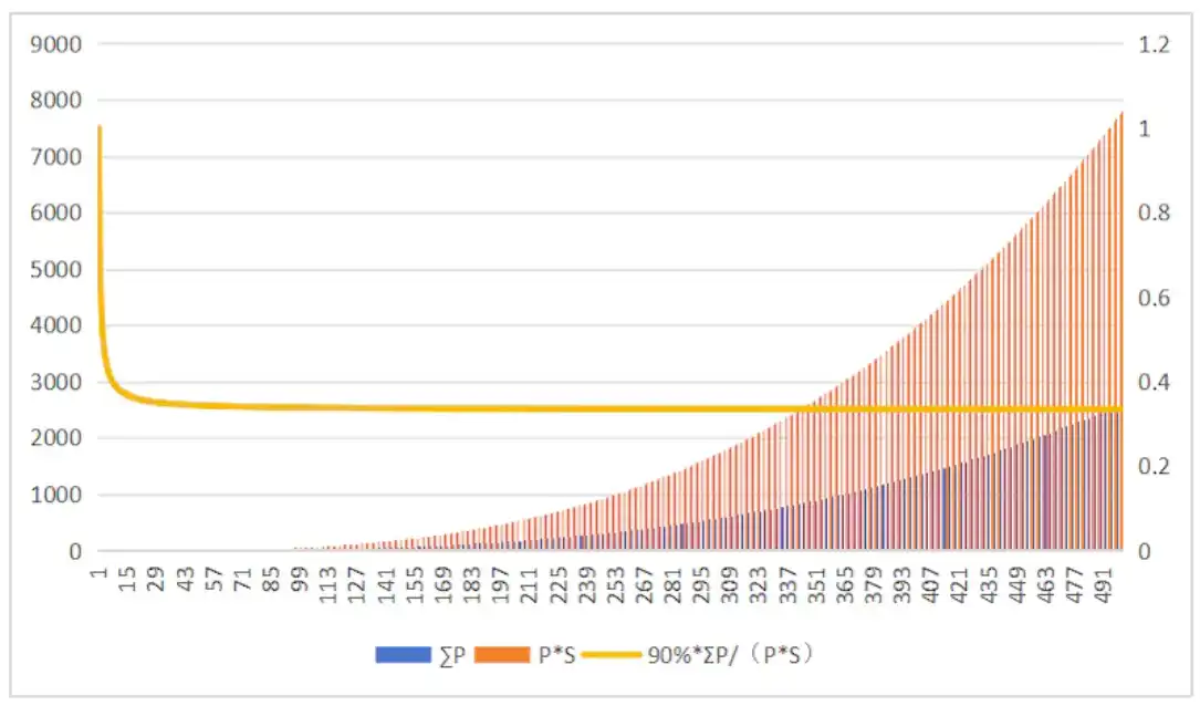 显然这是一条非常间接且高效的 Ponzi 曲线,每一个进入者都会推高价格,且推动的幅度会越来越高。至于 16000 也很好理解,我们需要一个参数,让 S 和 P 有一个符合市场的匹配关系。如下表所示,如果取值更小,P 曲线会过于陡峭,价格波动过大;而如果取值更大,价格曲线会更加平缓,不够 Ponzi,而 16000 是一个折中的选择。偏小的数量承载能力也符合当前市场流动性状况。