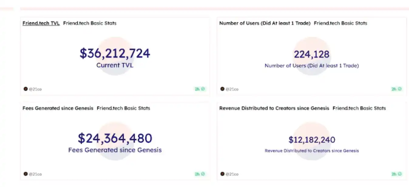 按照我们之前的算法,3600 万美元对应大约 1.1 亿美元的总市值,如果用这个计算并不夸张。但即使不考虑用户净提现和 Bot 净提现,磨擦最小的情况也是 4800 万美元进入这个市场,在交易了不到 2 个月以后,其中 1200 万美元已经属于 Friend.tech,即 25%。