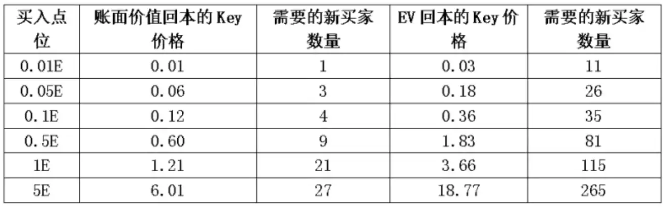 但从 EV 角度看,购买高价 Key 回本几乎是不可能的,如果购买 1E 的 Key,也需要 115 个新买家才能实现 EV 回本。**在协议数据和用户数量增长的时候,我们很自然地会把账面价值当作回本要素,但一旦增长停止或下滑这种计量会变得很不可靠。