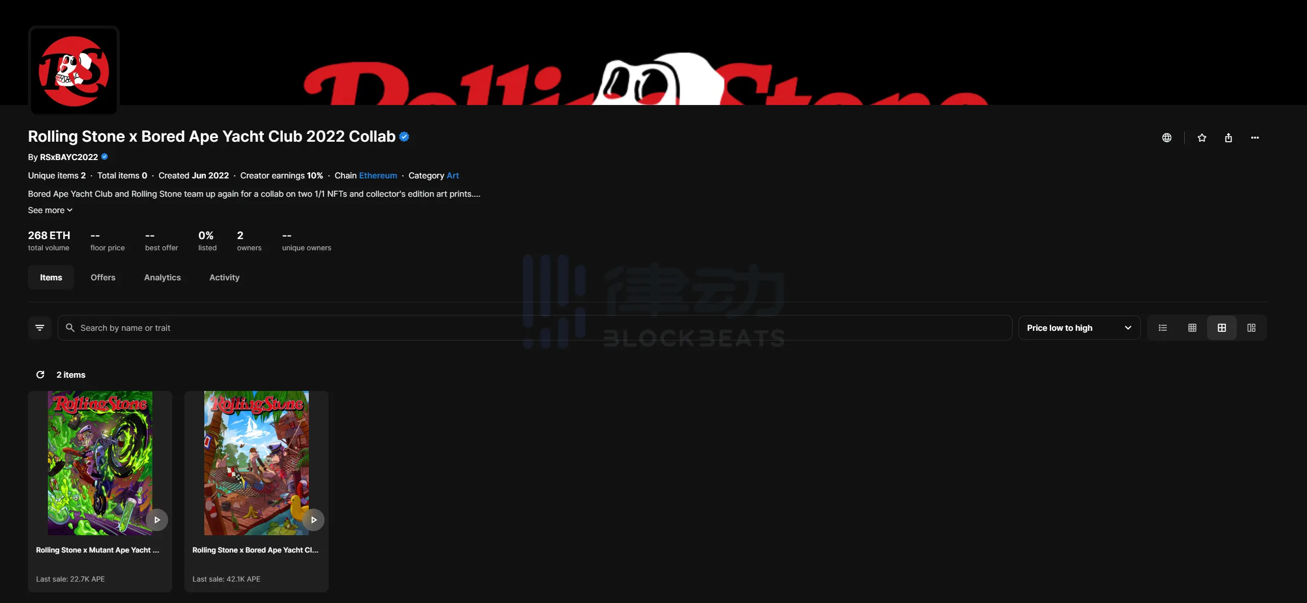 虽然我们已经习惯在熊市里挨熊,但是这次熊咱的是「滚石」,就显得挺讽刺... 因为去年 6 月,「滚石」杂志还和 BAYC 合作推出的两款联名 NFT,在当时分别以 40,101 枚 APE(约 18 万美元)和 19,696.969 枚 APE(约 8.6 万美元)完成了拍卖。