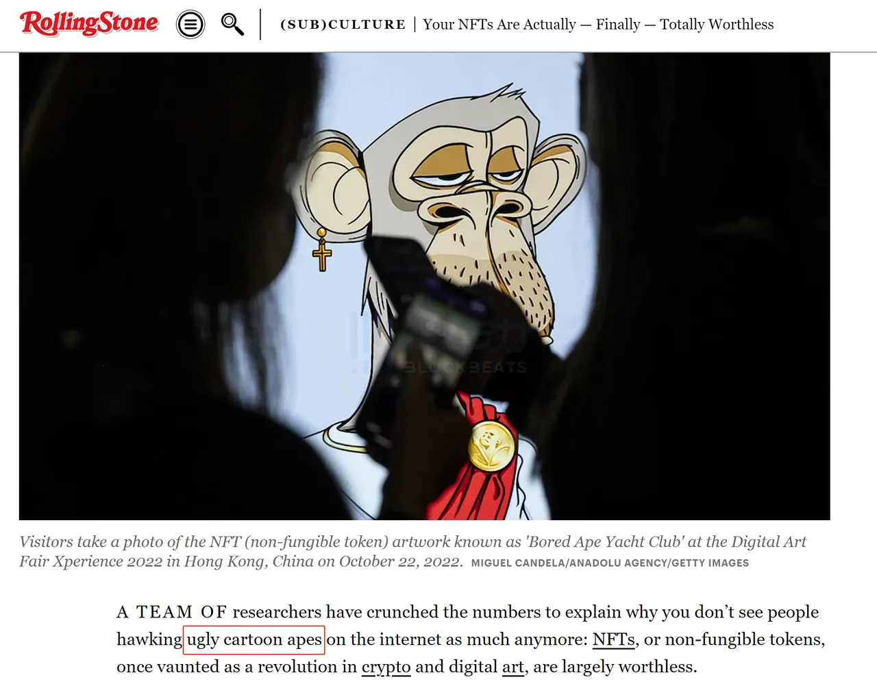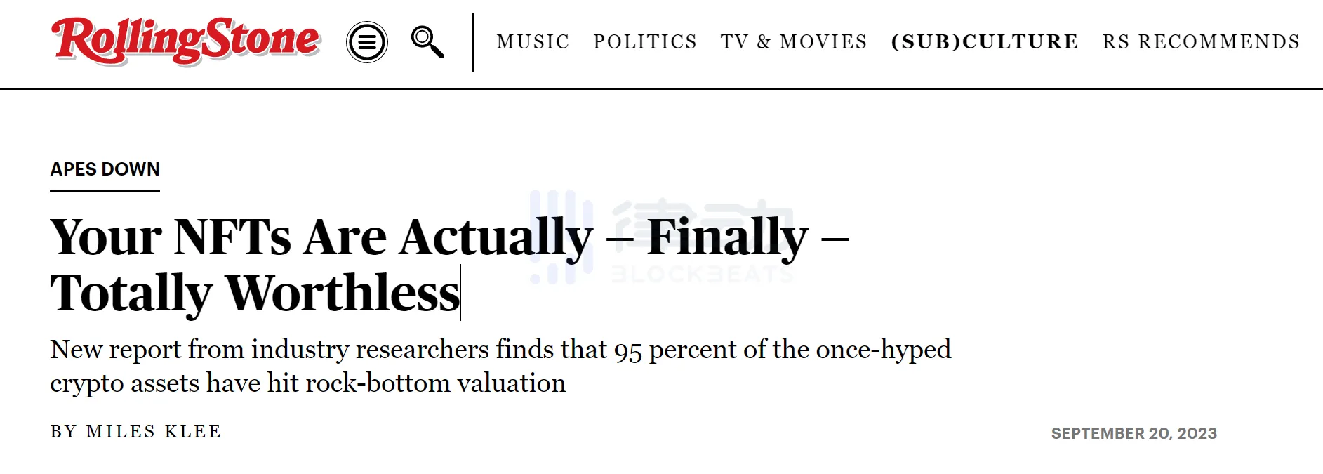 9 月 20 日,「滚石」杂志发布了这篇名为「你的 NFT 实际上完全没有任何价值,终于得证」的文章。