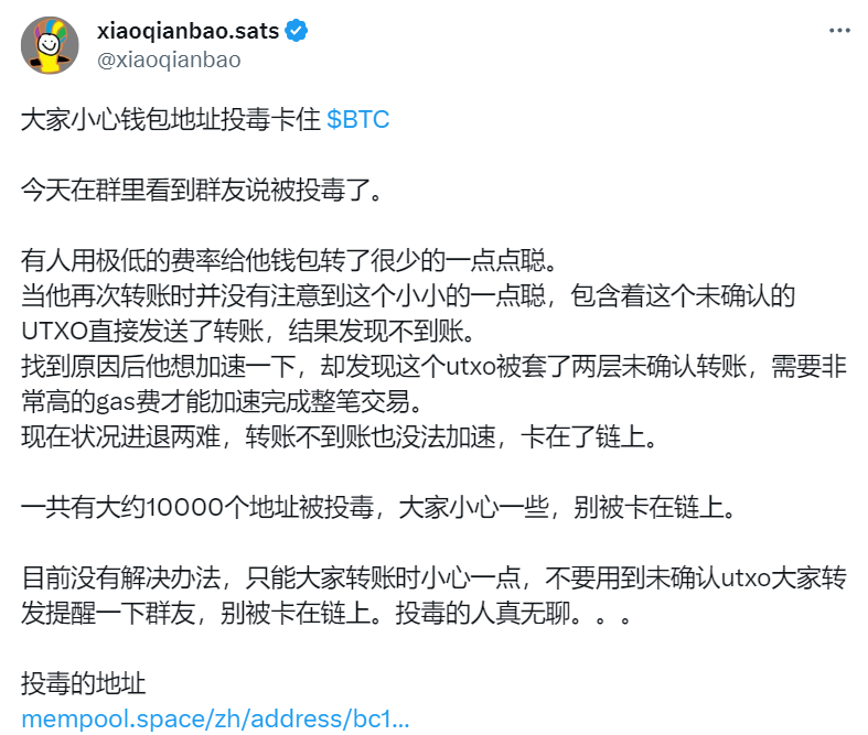 这种行为属于纯纯的损人不利己,又刚好发生在 BRC-20 Token $SATS 历时半年多快要全部 Mint 完成的关键时间点上,于是这个行为就被称为「投毒」。而 Casey 在 9 月 23 日发了这么一条推文: