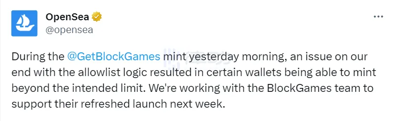 9 月 22 日,BlockGames 在 OpenSea 的 Launchpad 发射时出现了问题。OpenSea 承认了自己的错误,是白名单的逻辑存在问题导致特定的钱包地址能够「无上限铸造」。据 BlockGames CEO @benbaltram 的说法,提交白名单地址时 OpenSea 的前端存在问题,导致了这次严重的错误发生。
