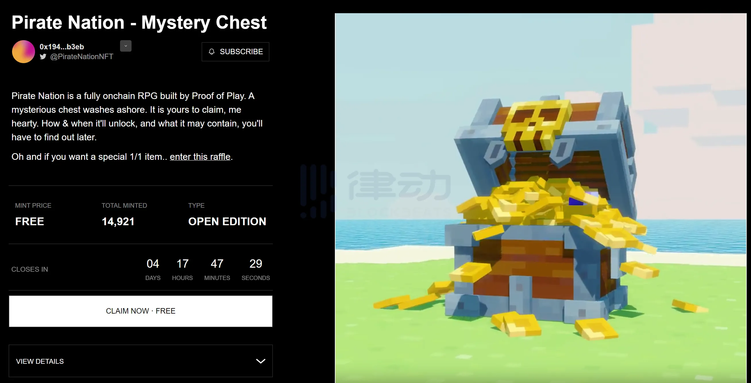 这是 Pirate Nation 官方免费发的 Open Edition 福利,具体是什么游戏道具、什么时间可以打开都不知道,但是想想 Proof of Play 刚拿了 3300 万美元融资,这玩意还免费,我想不会有人不领的...