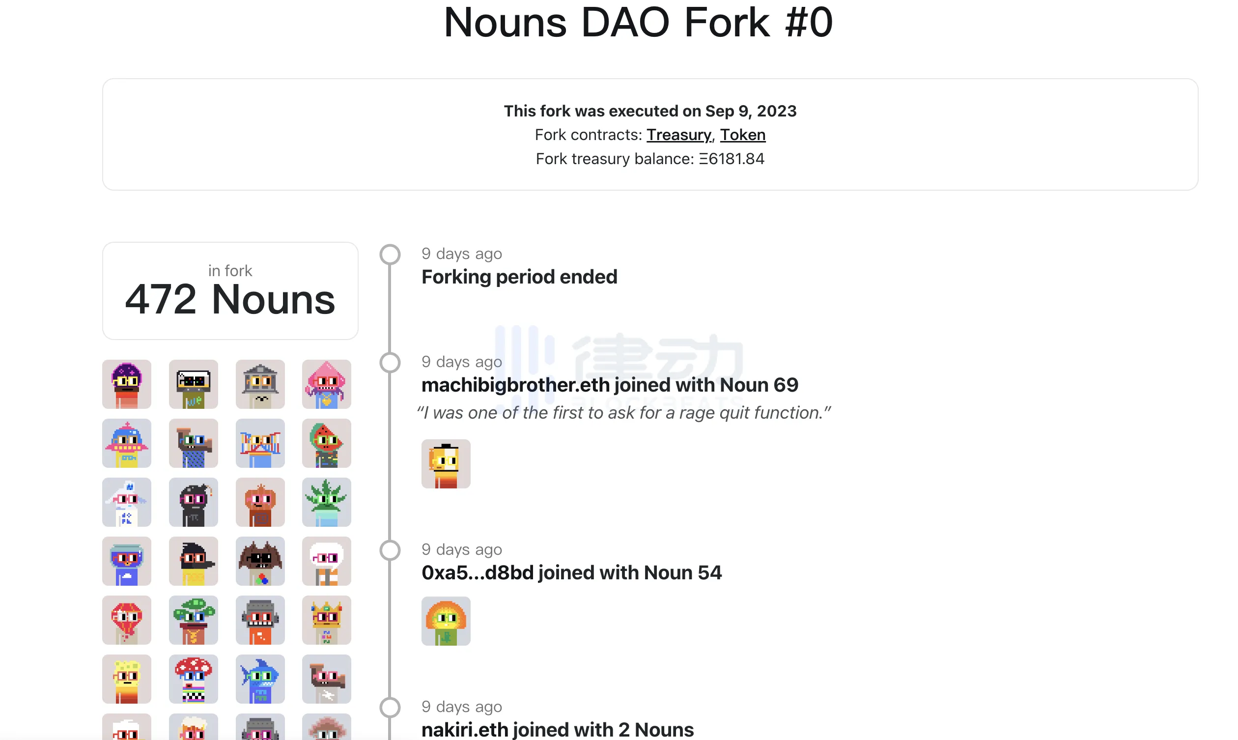 在 9 月 9 日时,就有 214 枚 Nouns NFT 选择加入分叉,超过了 20%,那时 NounsDAO 的分叉就已是注定发生的事。