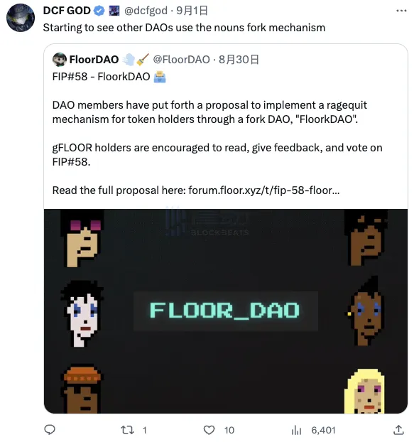 NounsDAO 的分叉方案,在其他 DAO 组织的治理中也引起了不少注意,成了其他 DAO 的参考蓝本。比如 FloorDAO 的成员也在社区提出了一项提案,通过分叉 DAO「FloorkDAO」为代币持有者实施愤怒退出机制。