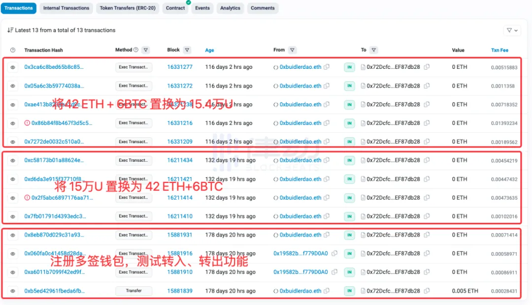 几个月后,BuidlerDAO 创始人魁小拔 Niels,针对这场风波公开发文进行澄清,认为这场风波起因于他与团队另一核心成员陈剑的矛盾。根据魁小拔 Niels 的澄清,他承认自己曾在 2022 年 12 月调整了国库中的 15 万 U 资产为 ETH 和 BTC,但这个操作是得到投资人的咨询和建议,且该操作并未有任何资金流向个人钱包或交易所的迹象。链上数据如下:https://etherscan.io/address/0x72Dcfc6F1Aa963d01b1D48C53a1b0630EF87db28。