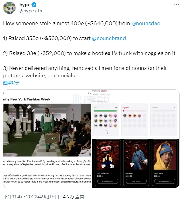 Kol hype(@hype_eth)也在社交媒体揭露了 nounsbrand 如何从国库偷走了近 400e(约 64 万美元):首先从国库筹集了 355e 开始建立品牌 nounsbrand,此后又从国库申请筹集了 33e 来制作带有摇头的盗版 LV 行李箱,然而他们从未交付任何东西。现在也删除了他们的图片,网站和社交网站上所有 nouns 相关的内容。