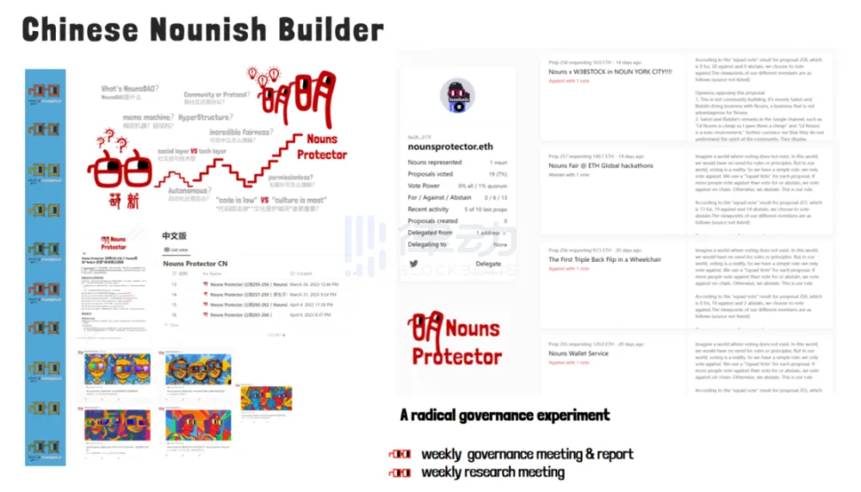 当有新的提案出现时,治理小组成员们在背后做了大量的调研,并在每周二晚上八点的会议上作出讨论。「有时候看到一些好提案,会很庆幸自己有选票,能给它个支持,这种值得花时间去研究。另一面,对于太坏了,想要击落的提案,庆幸有 Nouns Protector 这样的组织去监督。」