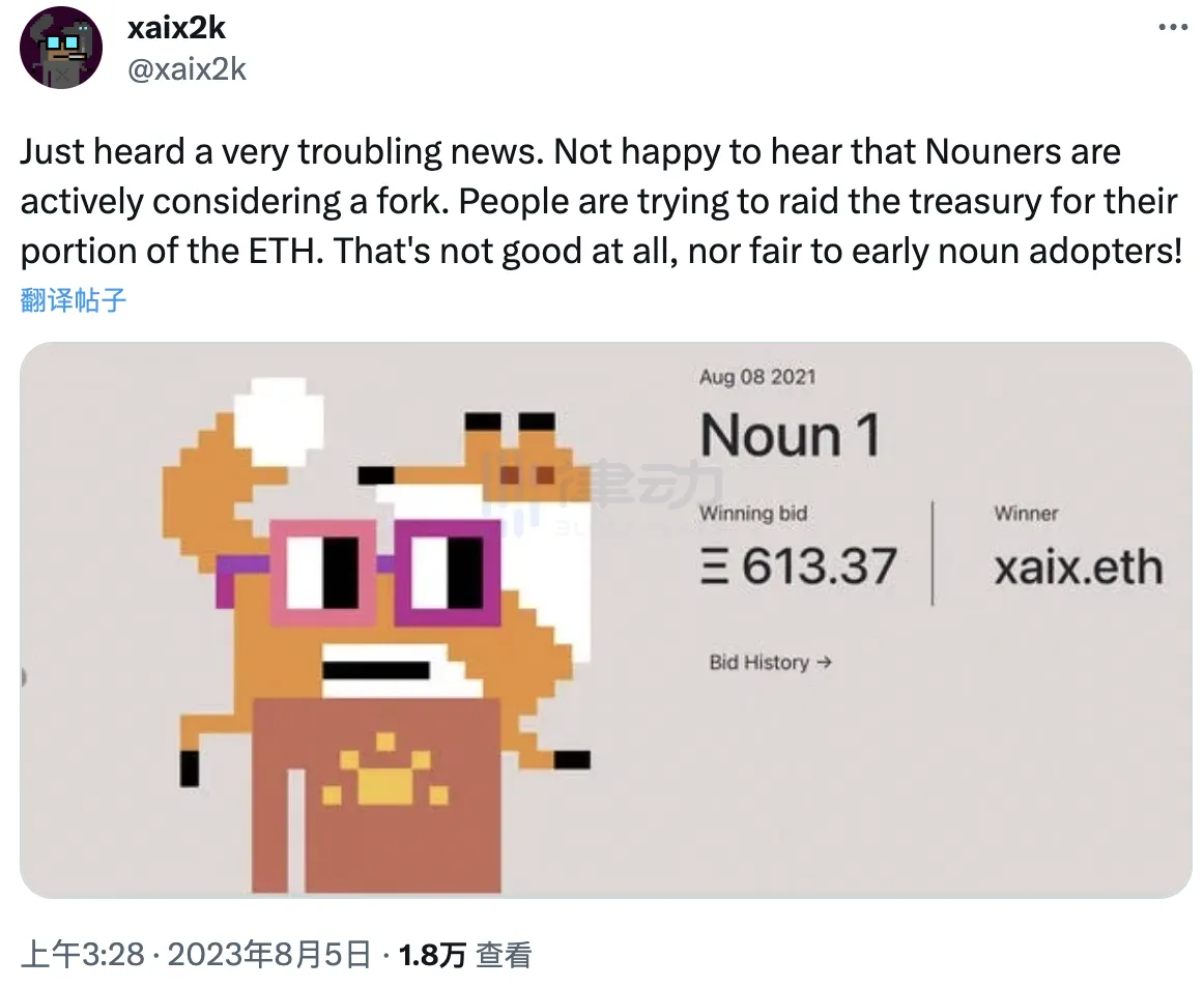 作为一个知名 NFT 收藏家,xaix2k 也是 Noun 1 的拥有者。他在 2021 年 8 月 8 日以 613.37 ETH 成功竞得了 Nouns 的首次拍卖。尽管他在后续对 Nouns 的发展评论不多,很明显他对于 Nouns 的这次分叉和怒退持保留态度,认为这对于早期的持有者并不公平。
