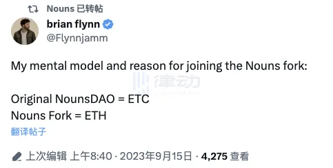 「当 NounsDAO 分叉时,我仿佛看到了 2016 年,那个以太坊与以太坊经典的分叉之刻。」与被很多 DAO 忽视的怒退相比,分叉更是加密行业最原生的文化之一。
