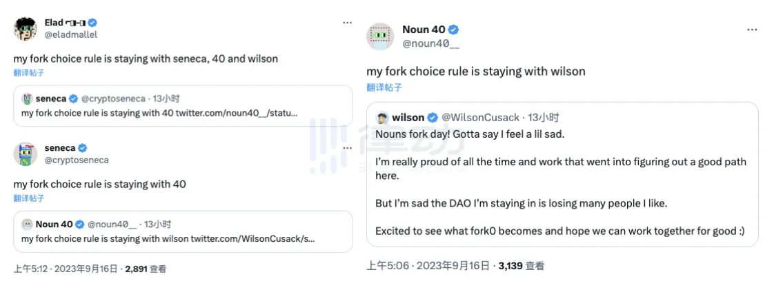 9 月 16 日,这一天被 Nouns 社区称为「分叉日」,NounsDAO 完成分叉。846 个 Nouns NFT 中的 472 个加入了分叉,选择离开 Nouns 的持有者超过了一半,他们从财库提走了近 2730 万美元的 ETH。