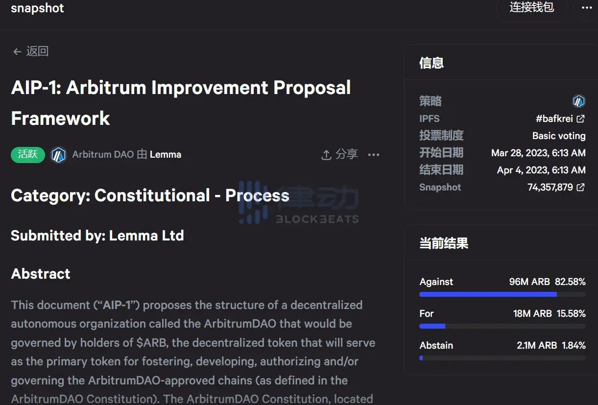 在某些 DeFi DAO 或社区 DAO 中,由于治理机制设计的缺陷或其他约束,过度的「人治」导致了不合理的决策或行动。3 月 28 日,Arbitrum 社区在 Snapshot 上发起 Arbitrum Improvement Proposal 1 (AIP-1) 提案投票,提案内容为拟引入由 ARB 持有者管理的去中心化自治组织结构 ArbitrumDAO,Arbitrum 基金会也将为 ArbitrumDAO 社区服务并受其管理。