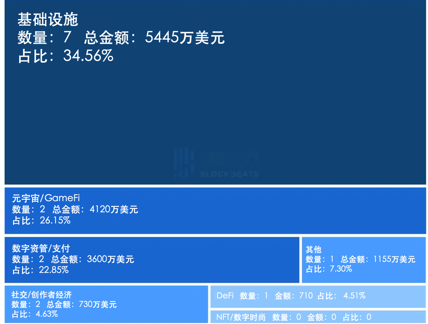 在基础设施领域共计 7 笔融资,总金额超 5445 万美元,占上周融资总额的 34.56%。