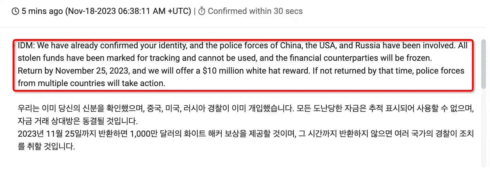 11 月 18 日,派盾 PeckShield 发文表示,Poloniex 被盗事件在跟踪方面似乎取得了有希望的进展,Justin Sun 在链上留言表示: 「我们已经确认了你的身份,中国、美国和俄罗斯的警察都已经介入。所有被盗资金都已被标记且不能使用,交易对手将被冻结。2023 年 11 月 25 日前归还资产,我们将提供 1000 万美元的白帽奖励。如果届时没有返回,来自多个国家的警察将采取行动。」
