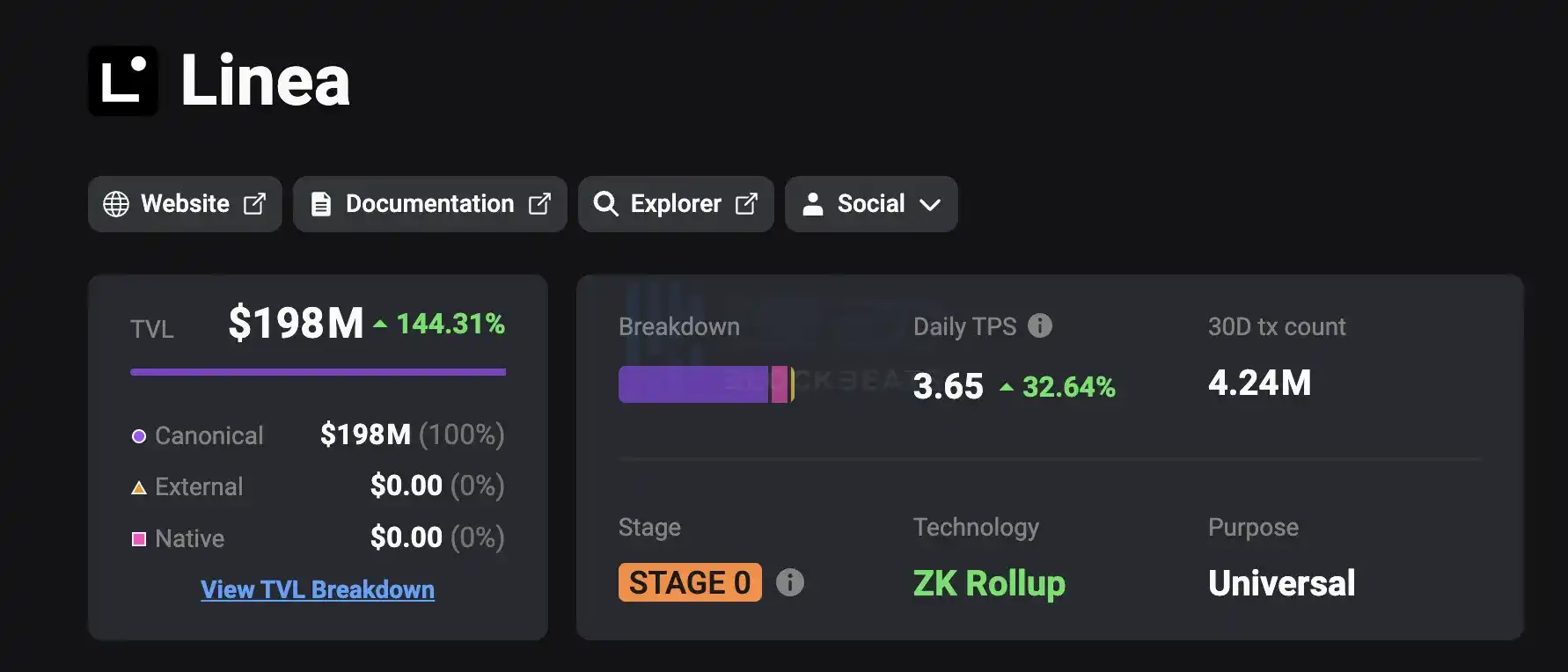 数据:Linea 网络 TVL 达 1.98 亿美元,7 日增幅 144.31%