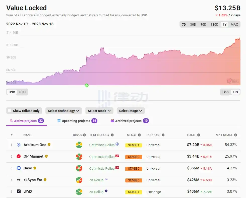 11 月 18 日,据 L2BEAT 数据显示,以太坊 Layer2 总锁仓量(TVL)回落至 132.5 亿美元,7 日跌幅 1.69%,其中锁仓量前五分别为: Arbitrum One(72.0 亿美元,7 日跌幅 3.35%); OP Mainnet(34.4 亿美元,7 日跌幅 0.41%); Base(5.66 亿美元,7 日跌幅 5.18%); zkSync Era(4.28 亿美元,7 日跌幅 6.53%);dYdX(4.06 亿美元,7 日涨幅 7.72%)。