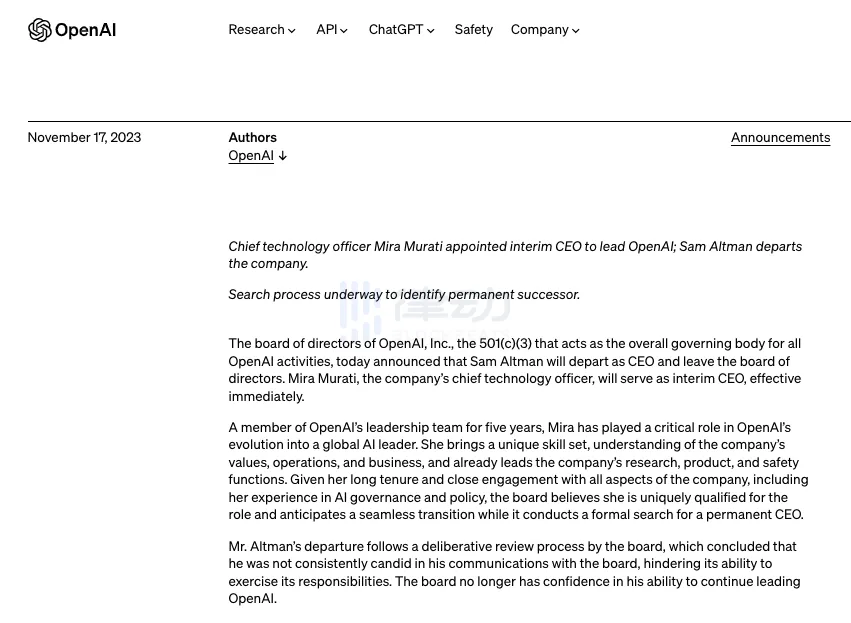 11 月 18 日,OpenAI 董事会宣布,首席执行官 Sam Altman 离职,并退出公司董事会,公司首席技术官 Mira Murati 被任命为临时 CEO。