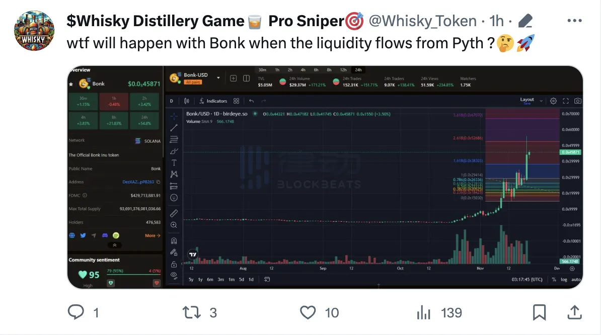今日早些时候,据 CoinGecko 行情信息显示,Solana 生态 Meme 代币 BONK 过去 24 小时涨幅达到 54.1%,截至发稿时价格为 0.00000473 美元,创历史新高。随着 BONK 的价格一路走高,社区用户不禁问道「当流动性从 Pyth 流出时,Bonk 会发生什么?」