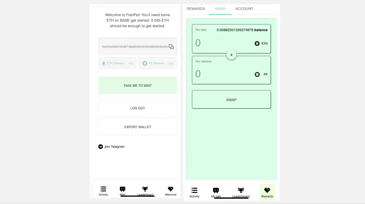 和 base 链上的另一款热门应用 friend.tech 一样,玩家需要获得邀请码,在手机端通过主屏幕网页进入 Fren Pet,并向游戏团队所提供的钱包中转入 ETH 才可以参与游戏。