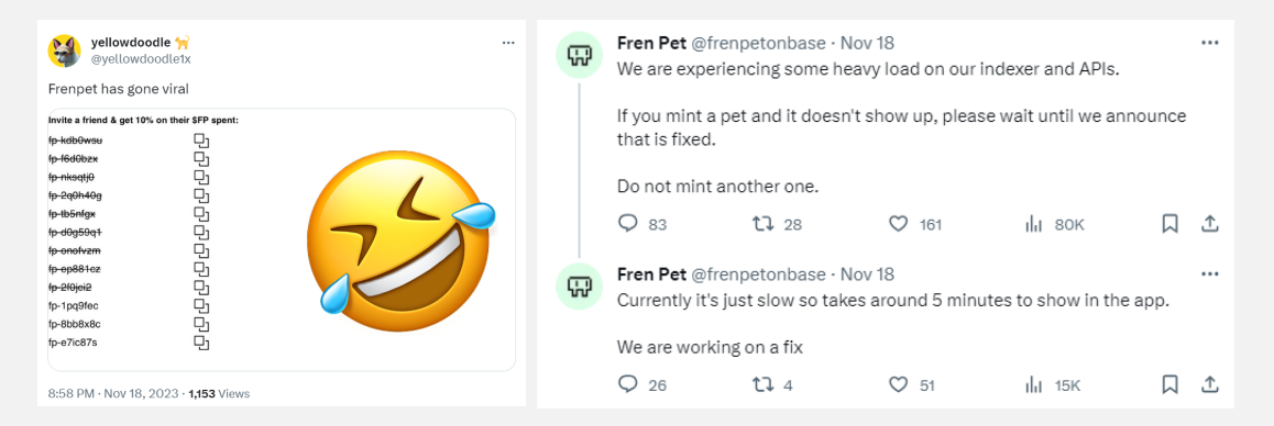 上周末,一款名为「Fren Pet」的宠物养成类链游得到了 Coinbase@CoinbaseWallet和 Base@BuildOnBase的官方账号宣传。随后,Fren Pet 获得了海外社区的高度关注,许多玩家在推特上寻找邀请码,涌入 Fren Pet。Fren pet 团队甚至表示游戏一度出现了 API 负载过重的问题。