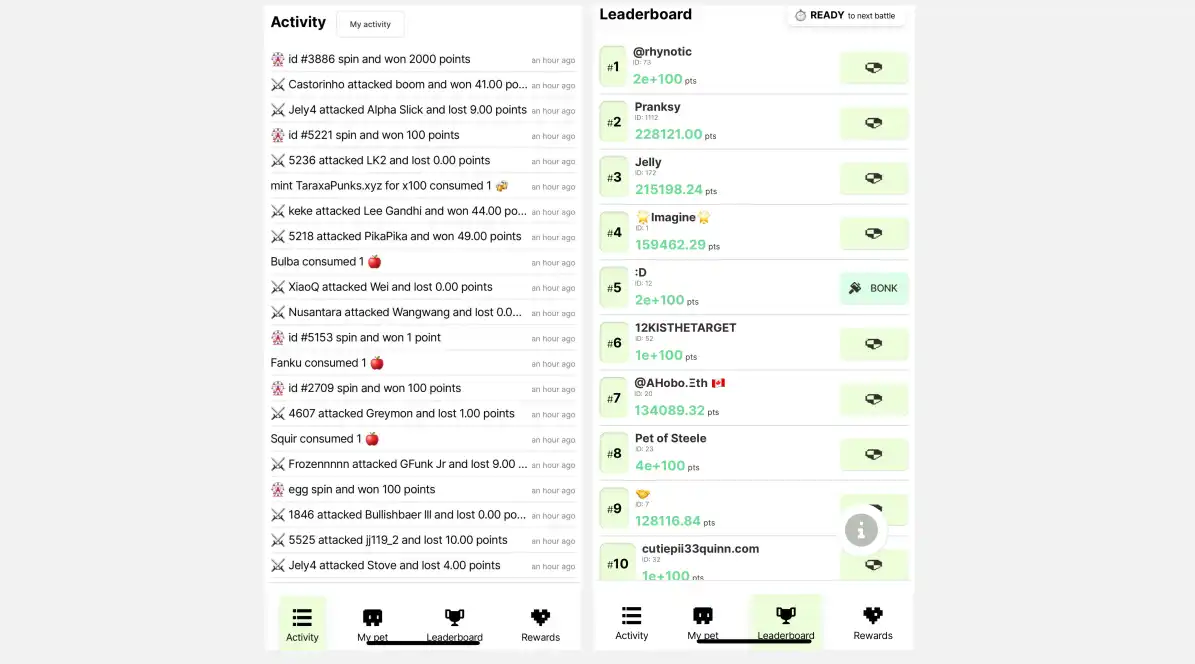 玩家的积分将在游戏内排行榜中显示,积分越多,玩家被分配的 ETH 就越多。获得积分的方式除了照顾宠物和每日一次的轮盘抽奖外,还可「Bonk」攻击排行榜中的其他玩家,获胜后可以得到积分。