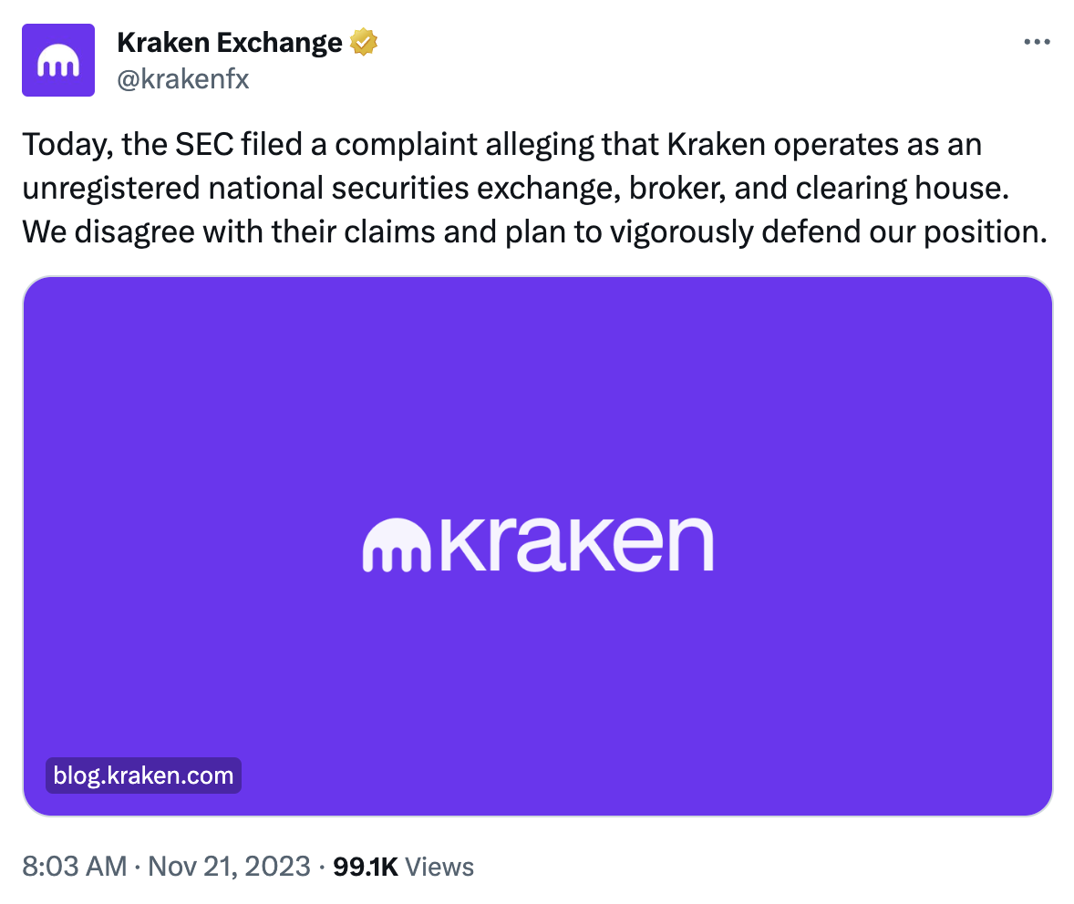 对此,Kraken 于 11 月 20 日快速发文回应,并于随后在社交平台发表动态进行强势反击,指出「法律站在我们这边」,而 SEC 的指控是「空洞的」,同时也是「违反法律的」。