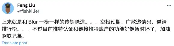 但也有不同的声音,前链闻总编辑 Liu Feng 表示「Blast 和 Blur 是一样的传销味道」,「积分制+邀请码+明牌空投」的开场似乎是投资方 paradigm 的常规营销手法,