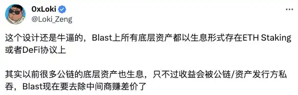 按照 Pacman 所描述的愿景,Blast 未来将支持所有类型的 Dapp,如 DEX、NFTFi、SocialFi 等应用场景。这种设计构想引起了社区的讨论,火币孵化器研究员 0xLoki 认为,用户在公链上质押资产收益并不是新鲜事,但 Blast 的出现可以避免「中间商赚差价」。