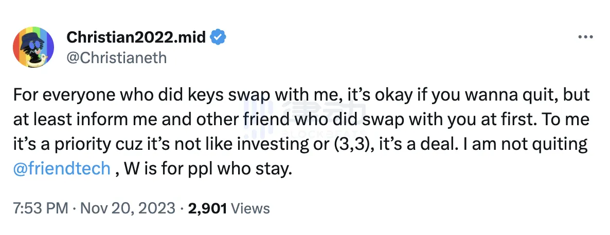 friend.tech用户Christian表明自己的态度;图源:@Christianeth
