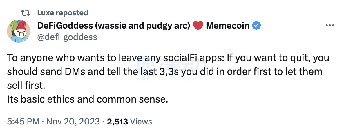 由此,friend.tech 的 SocialFi 标签中 Social 比例越来越小,Fi 的属性让一众交易者和获利机器人赢得了更高价值的利润。