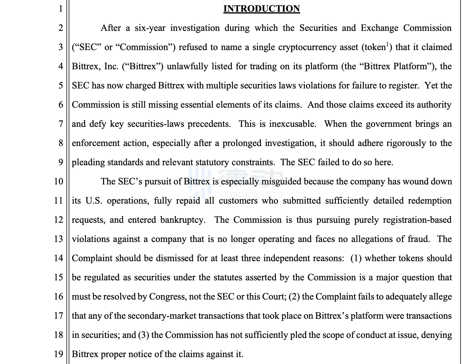 对于美国市场,Bittrex 并非没有尝试重新争取。7 月 2 日,Bittrex 提交了一份动议,驳回 SEC 对其提起的诉讼。Bittrex 辩称,除非得到国会的明确授权,否则 SEC 不具备将加密货币作为证券进行监管的必要权力。