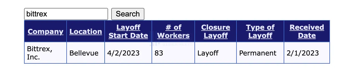 此后到了 2023 年 2 月,Bittrex 开始陆续裁员。截止到今年 2 月,根据 LinkedIn 数据库,Bittrex 拥有 284 名员工。随后,美国就业保障部警告称,加密货币交易所 Bittrex 将从 4 月 2 日开始裁员 83 人。