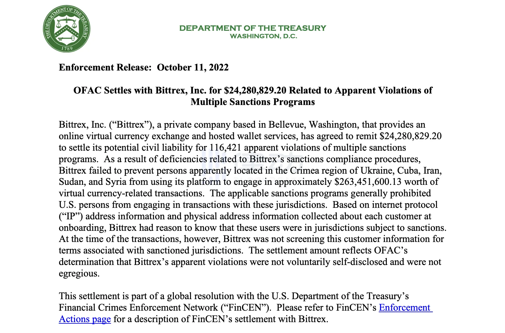 好景不长,到了 2022 年,美国监管力量便沉沉地压了下来。2022 年 10 月 11 日,美国财政部外国资产控制办公室 (OFAC) 和金融犯罪执法网 (FinCEN) 宣布,与总部位于华盛顿的虚拟货币交易平台 Bittrex 分别达成超过 2400 万美元和 2900 万美元的和解。