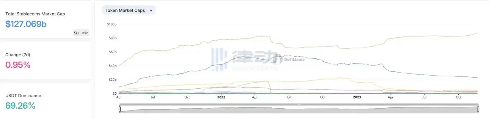 据 Defillama 数据信息,稳定币总市值达 1270.69 亿美元,较上周增加 0.95%。此外,USDT 流通量已超 880 亿美元,稳定币市占率达 69.26%。