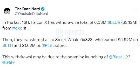 FalconX 从 OKX 提取 603 万枚 BLUR,全部转入某高胜率鲸鱼钱包