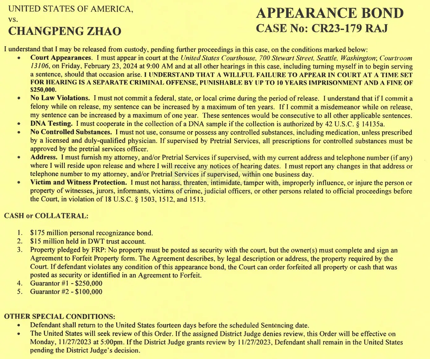 Binance 创始人兼前首席执行官 CZ 已因缴纳 1.75 亿美元个人担保而获释,量刑听证会定于太平洋时间 2024 年 2 月 23 日 9:00(北京时间 2 月 24 日 1:00)举行。CZ 的释放条款禁止他触犯法律、与证人或受害者调情或服用任何非处方管制药物,这是保释中的正常规定。CZ 被允许离开美国,并称他必须在宣判前 14 天返回。