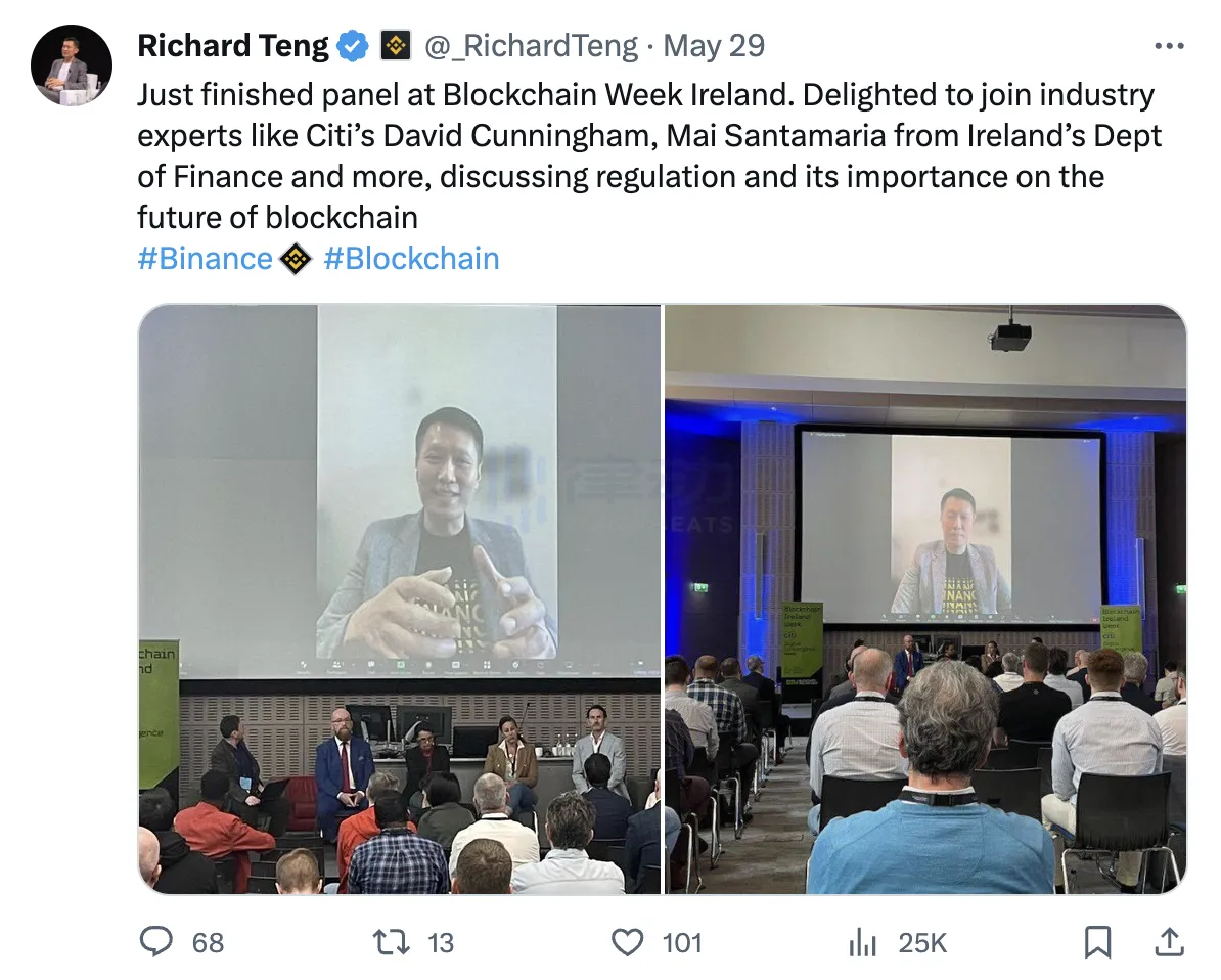 自此后,Richard Teng 经常作为 Binance 的「代言人」出席各类加密行业重要活动。2023 年 5 月,Richard Teng 在爱尔兰区块链周上代表 Binance 与花旗银行、爱尔兰财政部官员等行业专家一起讨论监管及其对区块链未来的重要性。