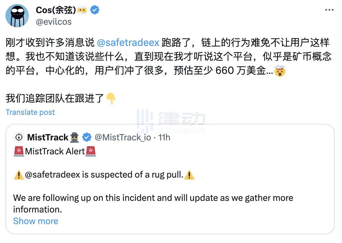 事实上,本次事件中,不少人质疑 SafeTrade 有跑路嫌疑。11 月 22 日,据慢雾(MistTrack)监测,SafeTrade Exchange 涉嫌 Rug Pull。慢雾创始人余弦表示,本次受影响资金预估至少 660 万美元。