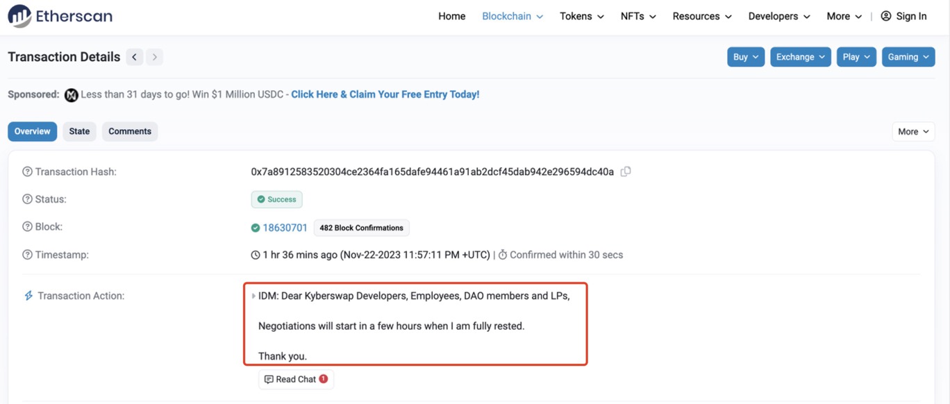 11 月 23 日 08:11,标记为「KyberSwap Exploiter 1」的攻击者地址于链上留言称,「亲爱的 KyberSwap 开发人员、员工、DAO 成员和流动性提供者,我将在几小时内充分休息后开始谈判。谢谢。」