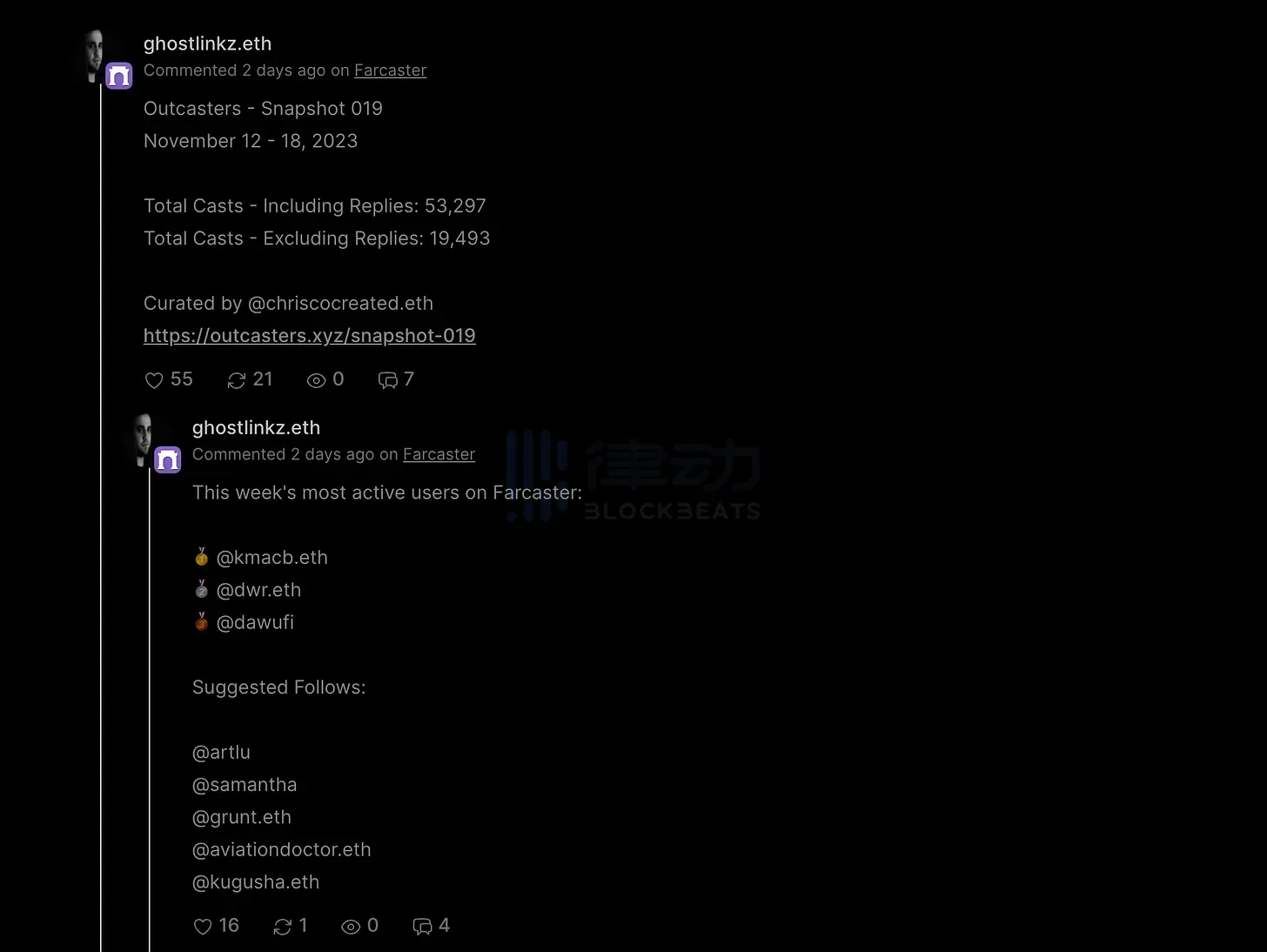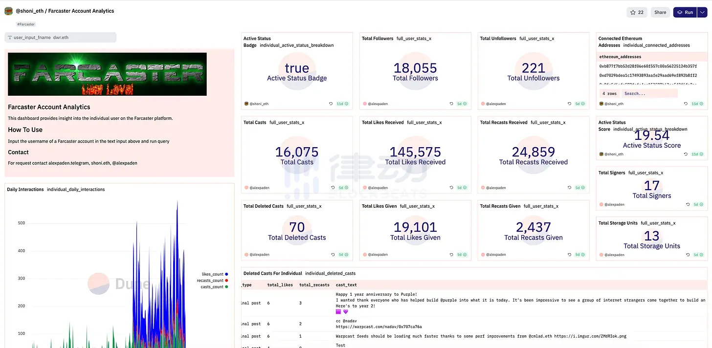 为了演示你的数据公开程度,最近 Dune 也整合了 Farcaster。以下是一个 Dune 仪表板的例子,可以为你自始至终的一切活动信息(包括已删除的消息)提供分析!