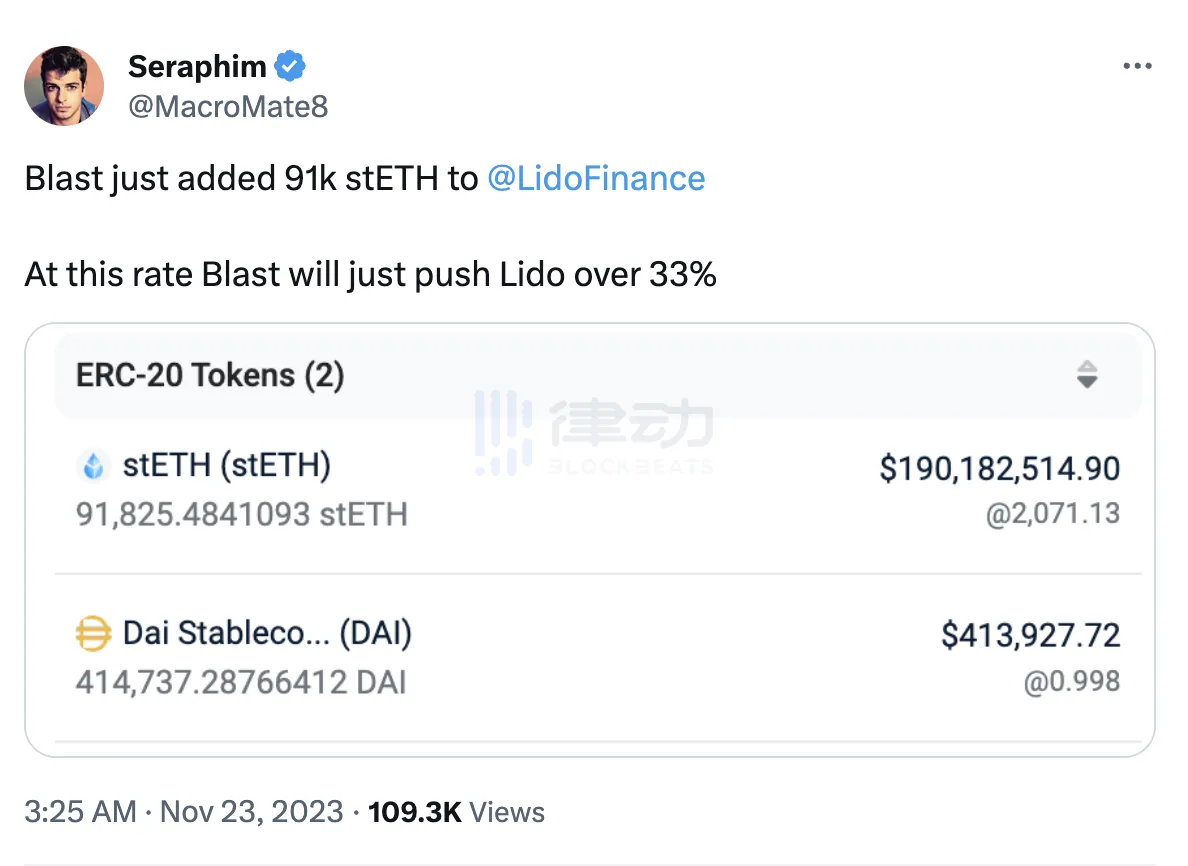 显然 Blast 的质押数据给出了答案。Lido DeFi 拓展负责人@MacroMate8在推文中称 Blast 昨夜向 Lido 添加了 91,000 枚 stETH,「按照这个速度,Blast 会将 Lido 推高至 33% 以上。」