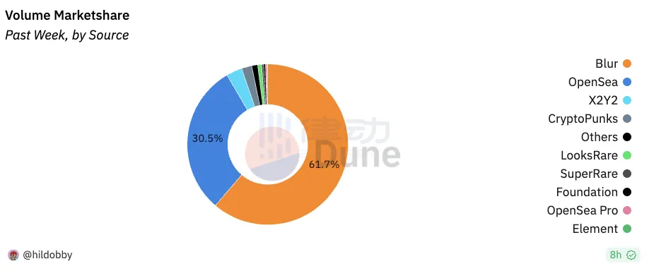 2022 年 10 月 19 日 Blur 问世,同年 11 月 27 日,Blur 以 5500 枚 ETH 的交易量超越了 Opensea 5300 枚 ETH 的交易量。截至 2023 年 11 月,Blur 凭借 4317 万美元的销售额,占据了 61.7% 的市场份额,已成为 NFT 市场的领头羊。