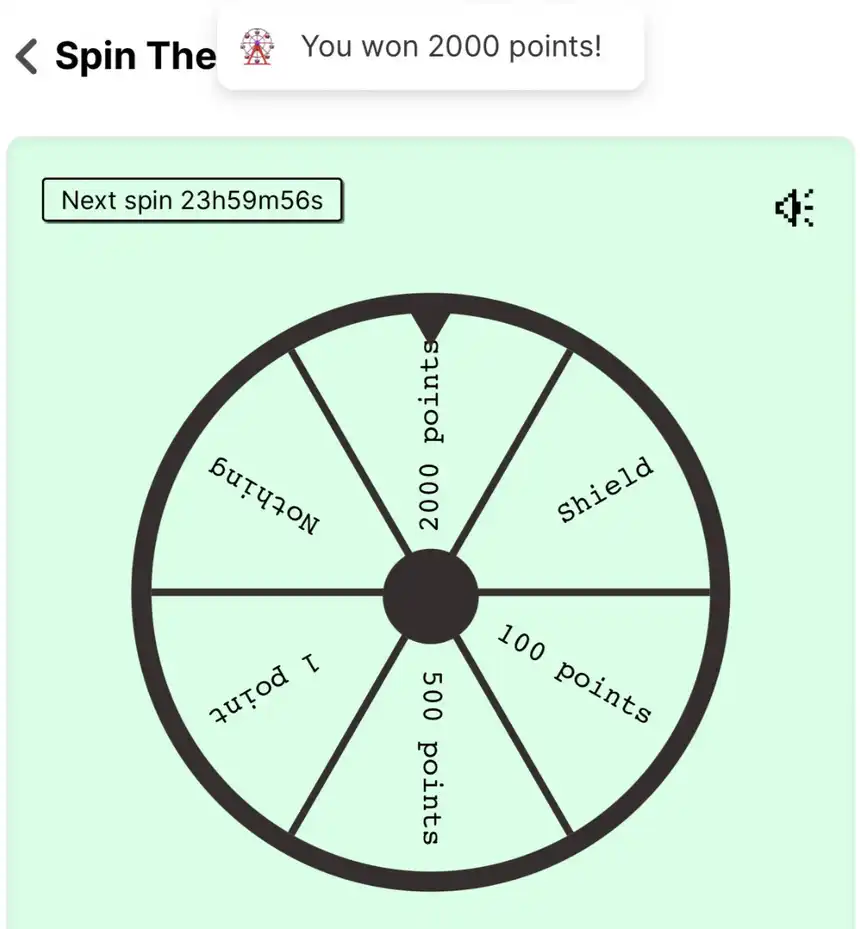 ·给予用户低成本的未来收益预期,激励正向的社交扩散:每只宠物每天都有一次转动轮盘抽奖的机会,奖励从 1 积分到 2000 积分不等,也有可能获得护盾等特殊奖励,或是什么都没抽到。免费转盘给予了用户低成本的未来收益预期,并利用了玩家喜欢抽奖的心理,激励玩家持续不断的参与游戏,增加了用户与游戏的交互频率。而且,免费转盘也会激励用户正向的社交扩散。当用户抽到高额奖励时,他们会倾向于在社交媒体上发帖分享,这也会给 Fren Pet 带来更多的新流量。