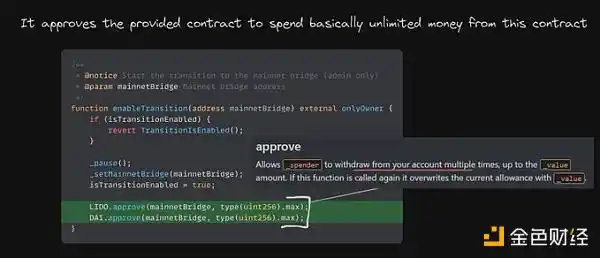 18.它绝对可以是任何东西!Blast 批准任意「mainnetBridge」合约,以花费最大可能数量的 LIDO 和 DAI…